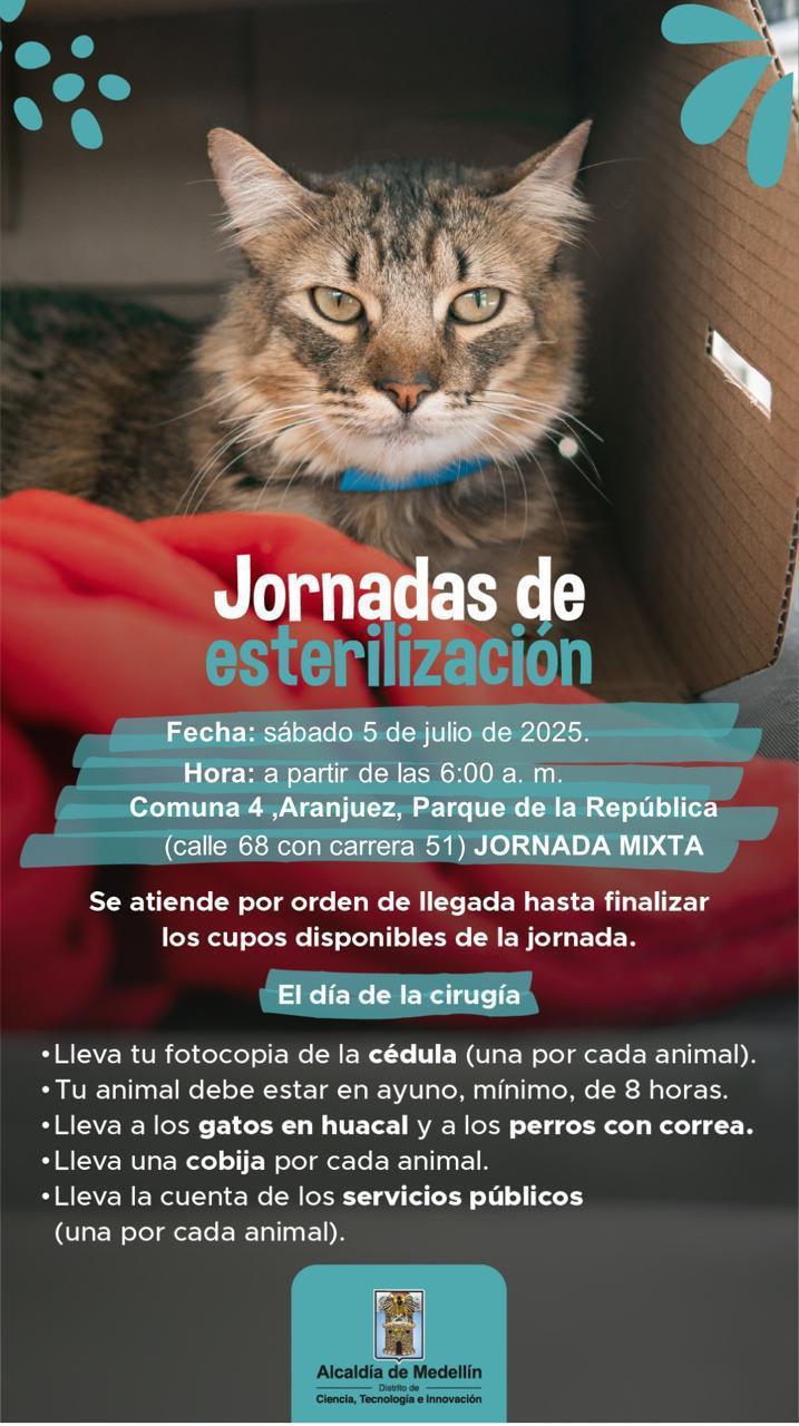 🏬La Alcaldía de Medellín, a través de la Unidad de Bienestar Animal, en convenio con diferentes entidades, continúa realizando jornadas de esterilización en puntos estratégicos de nuestra Comuna 4 – Aranjuez.