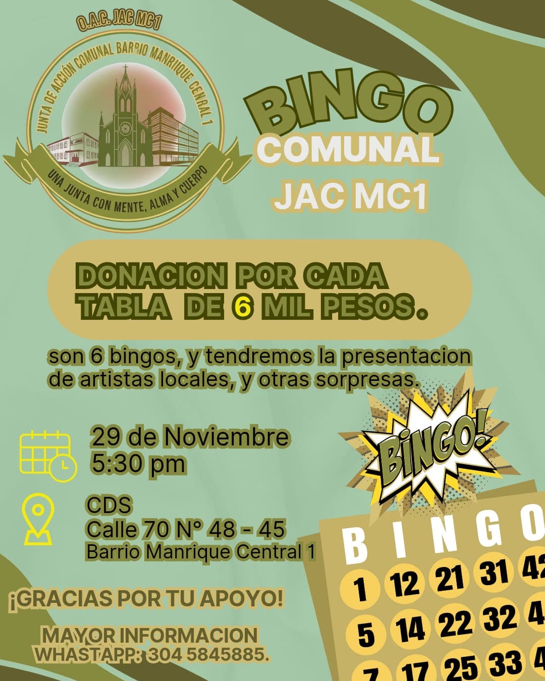 🤩 La Junta de Acción Comunal del barrio Manrique Central N.º 1 invita a toda la comunidad a participar en un gran bingo comunal, con 6 bingos, una presentación especial y una variada oferta gastronómica para disfrutar en familia.