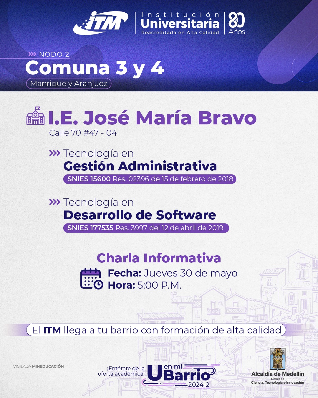🏫El ITM llega a las Comunas 3 y 4, para presentar los programas tecnológicos de alta calidad. 📆Fecha: Jueves, 30 de mayo 🕐Hora: 05:00 P.M. 📍Lugar: I.E. José María Bravo, calle 70 # 47-04 🤔Entérate de esta oferta académica que trae el ITM a las Comuna 3 y 4. ¡Te esperamos!