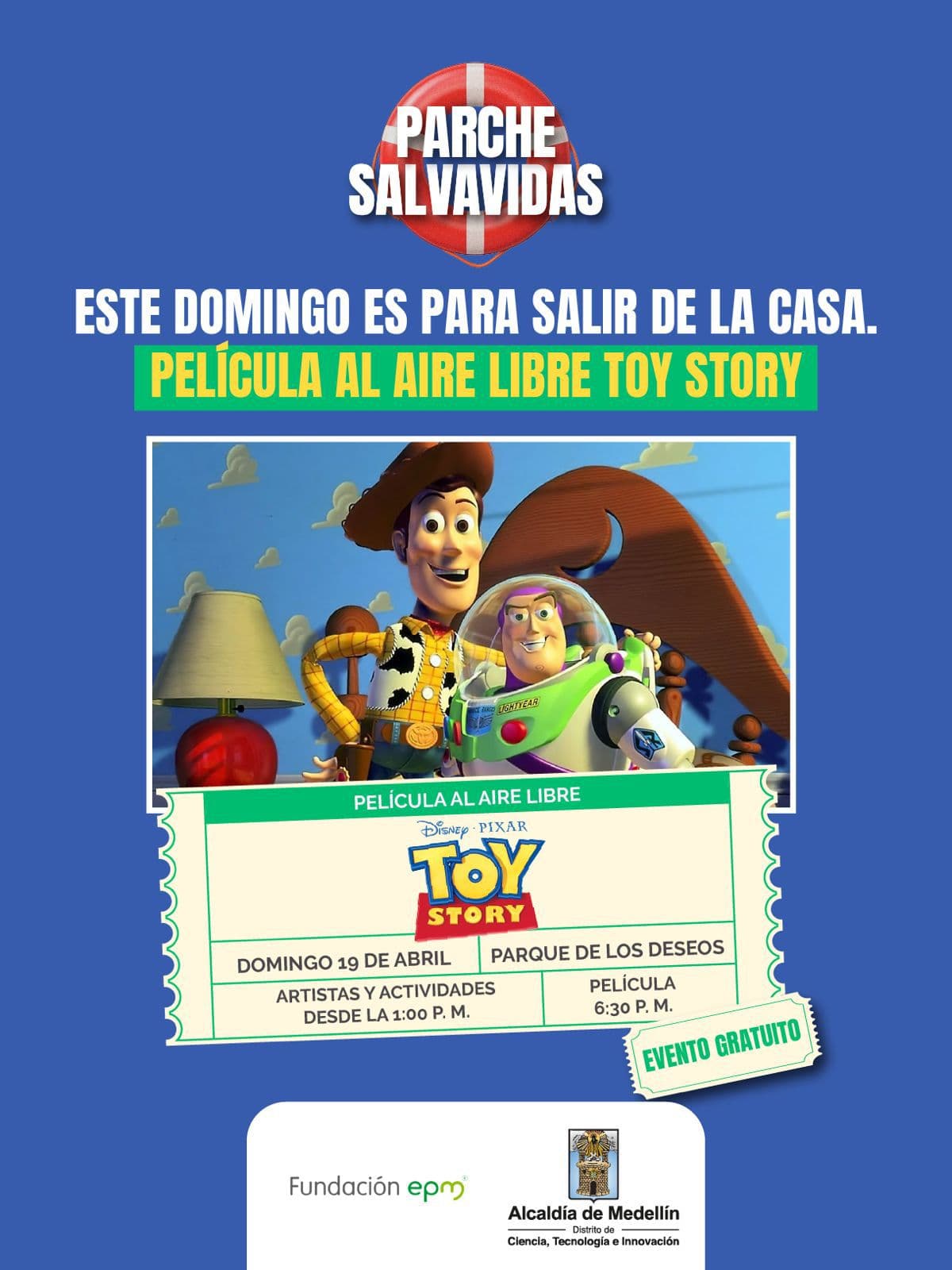 🍿 Desde la Fundación EPM y la Alcaldía de Medellín invitan a la comunidad a disfrutar de una tarde diferente en el «Parche Salvavidas». Un espacio para salir de la rutina con la proyección de la película Toy Story, acompañada de artistas invitados, juegos, escuchaderos y una feria para disfrutar en familia y con amigos. No es domingo de bajón, es domingo de cine gratis