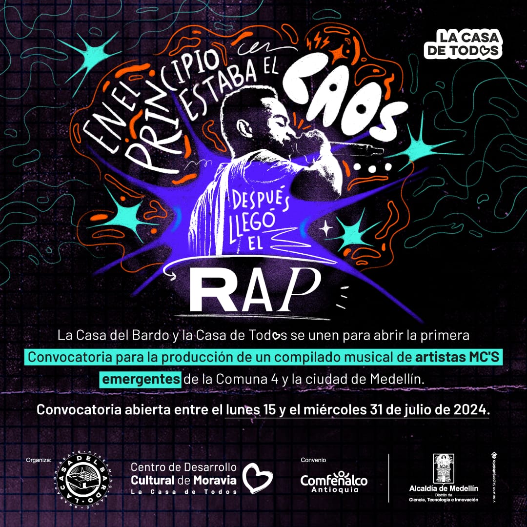 🖇️ La CASA DEL BARDO y Centro de Desarrollo Cultural de Moravia, lanzan la primera convocatoria para MC’s (RAP) emergentes, para la producción de un disco compilado digital.