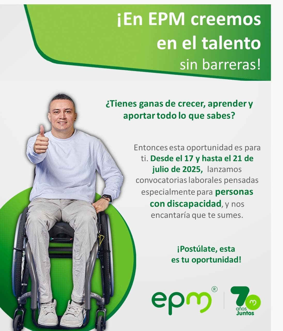 📝Del 17 al 21 de julio de 2025, EPM abre una convocatoria laboral exclusiva para personas con discapacidad. Una oportunidad para crecer, aprender y aportar todo lo que saben.