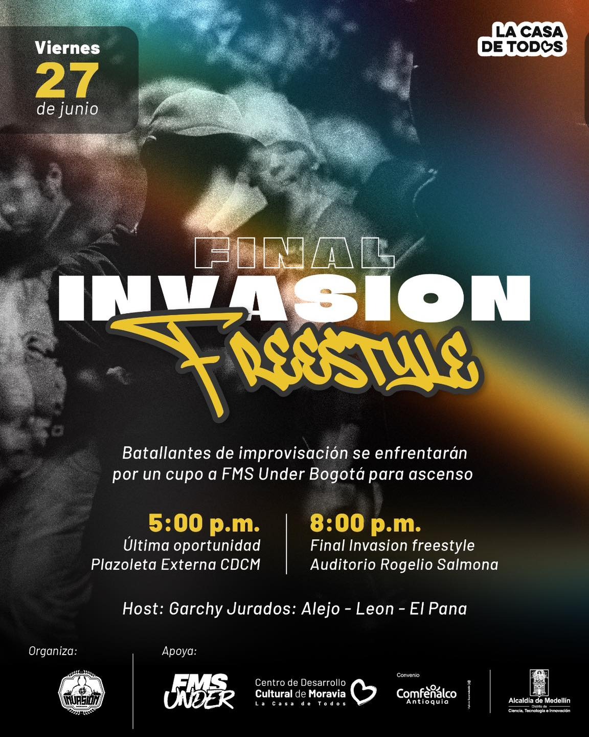 Organiza: Liga de Freestyle de Medellín, con el apoyo de FMS UNDER, el CDCM, Comfenalco y la Alcaldía de Medellín.