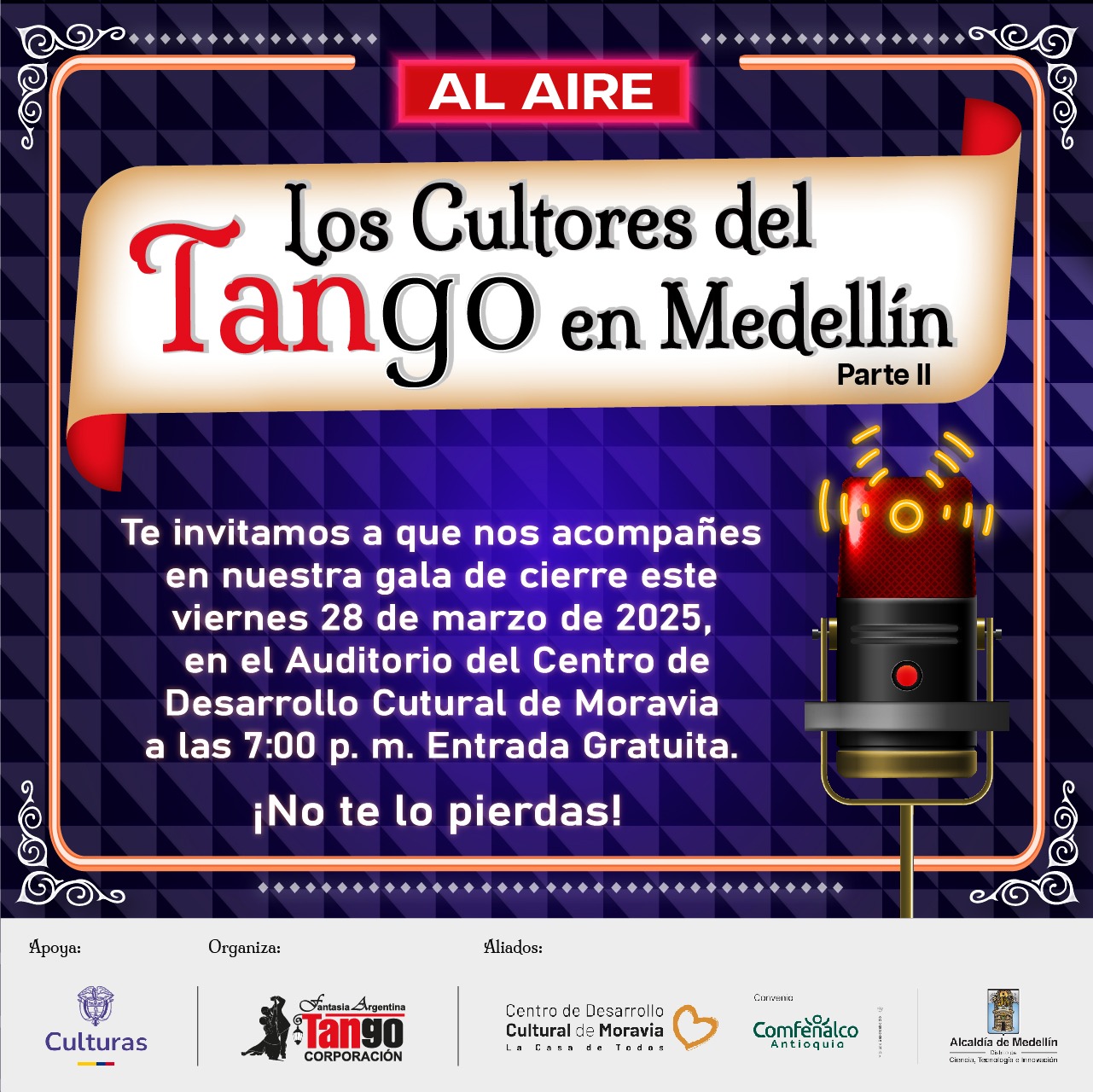 👠 La Corporación Fantasía Argentina Tango te invita a la gala de cierre del proyecto ganador de la Convocatoria de Concertación Cultural del Ministerio de las Culturas, las Artes y los Saberes 2025 llamado PODCAST: LOS CULTORES DEL TANGO EN MEDELLÍN – PARTE II, tu presencia es muy importante, ese día se contará con la participación de algunos de los cultores que estuvieron en esta temporada, tendrás la oportunidad de conocer sobre el proceso y también habrá una muestra artística.