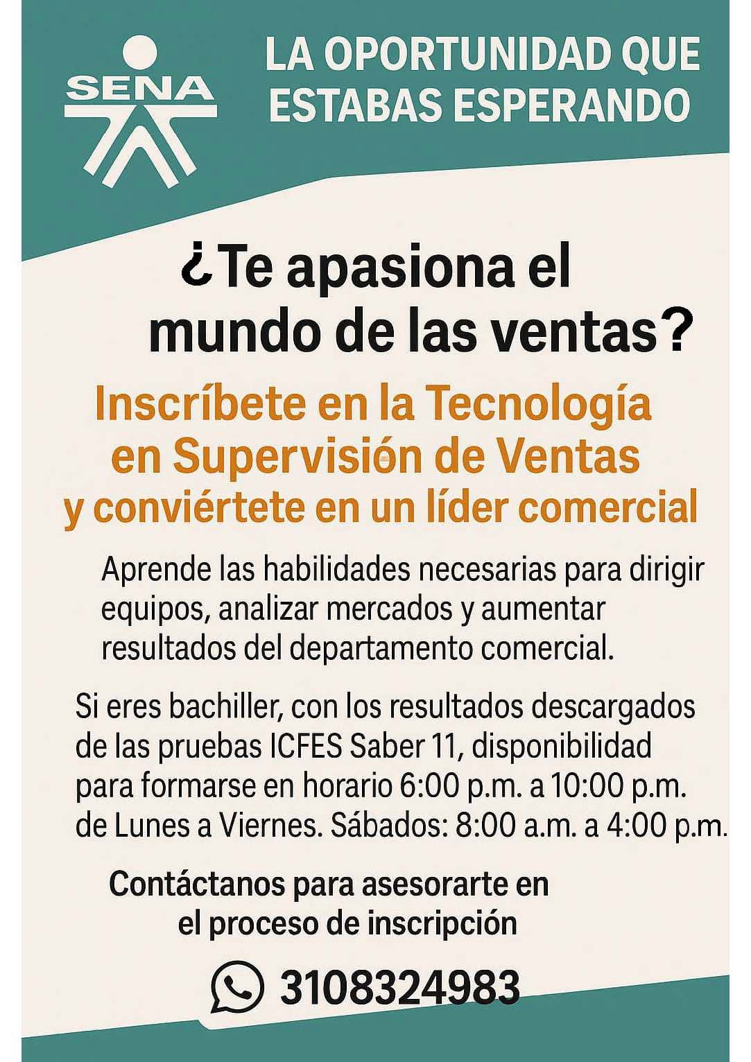 🎓 El SENA tiene inscripciones abiertas para su programa de Tecnología en Supervisión de Ventas. Si eres bachiller, cuentas con los resultados del ICFES 11 y tienes disponibilidad para estudiar de lunes a viernes de 6:00 p.m. a 10:00 p.m. y sábados de 8:00 a.m. a 4:00 p.m., ¡este programa es para ti!