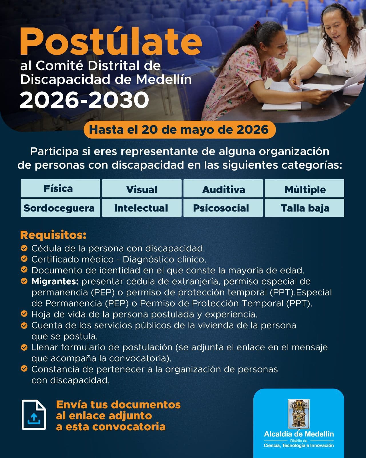 🙌 Se informa a la ciudadanía de Medellín que se encuentran abiertas las inscripciones para participar en el Comité Distrital de Discapacidad de Medellín 2026-2030. Esta convocatoria busca integrar a personas que deseen generar propuestas activas y aportar al mejoramiento de la calidad de vida de esta población, permitiendo que sus voces tengan un peso real en las decisiones del Distrito.