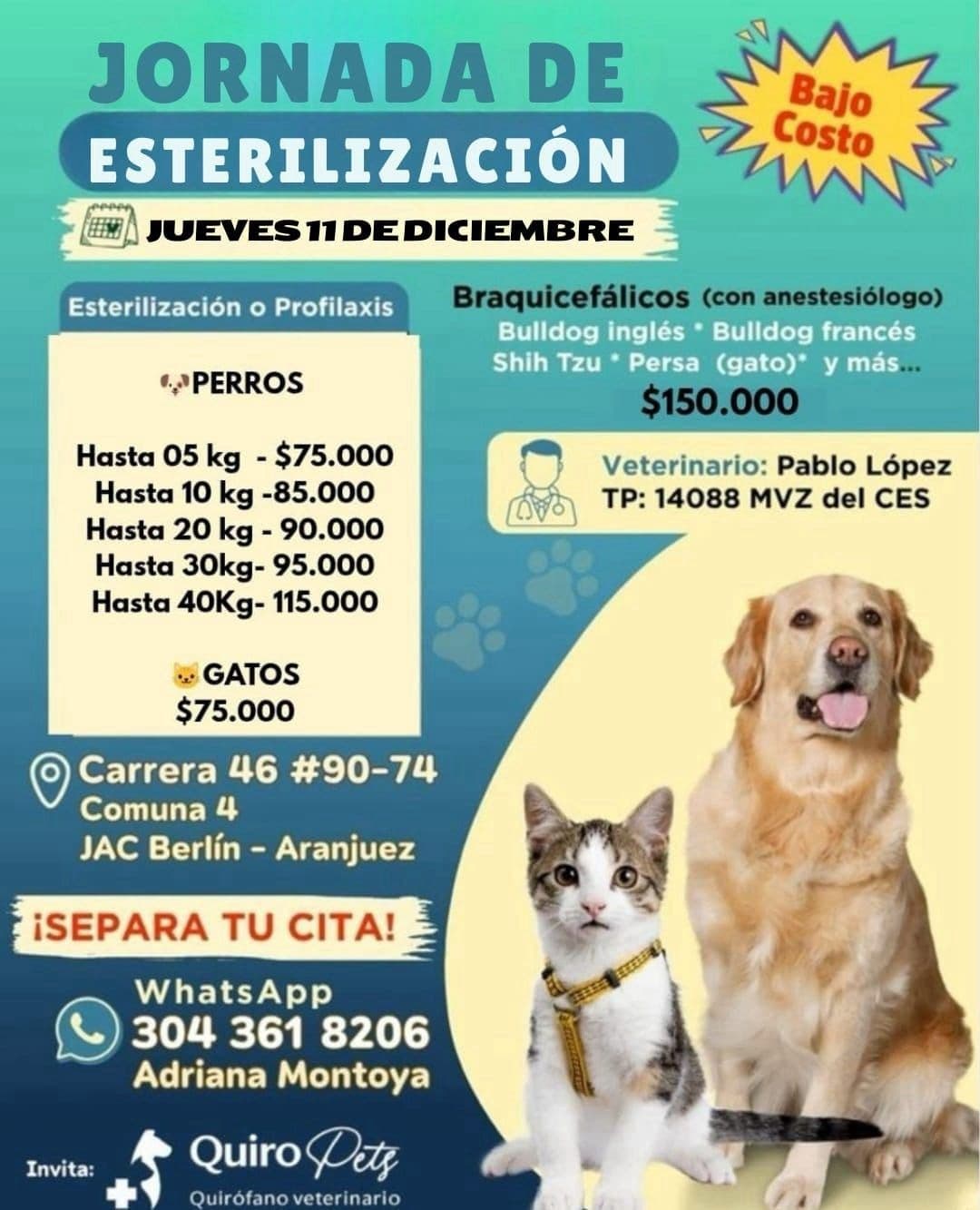 🩺La jornada contará con la atención del médico veterinario Pablo López (TP 14088 – MVZ del CES) y ofrecerá tarifas especiales según peso, además de un valor fijo para gatos. También habrá atención para razas braquicéfalas con anestesiólogo especializado.