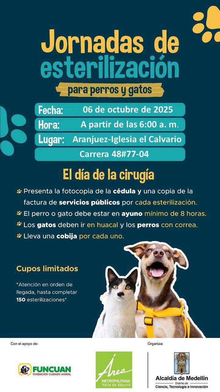 💚🐾 Si amas a tu mascota y quieres darle una vida más sana y feliz, esta es tu oportunidad. La Alcaldía de Medellín, el Área Metropolitana del Valle de Aburrá y la Fundación FUNCUAN te invitan a participar en una jornada especial de esterilización gratuita, pensada para el cuidado y bienestar de nuestros mejores amigos de cuatro patas.
