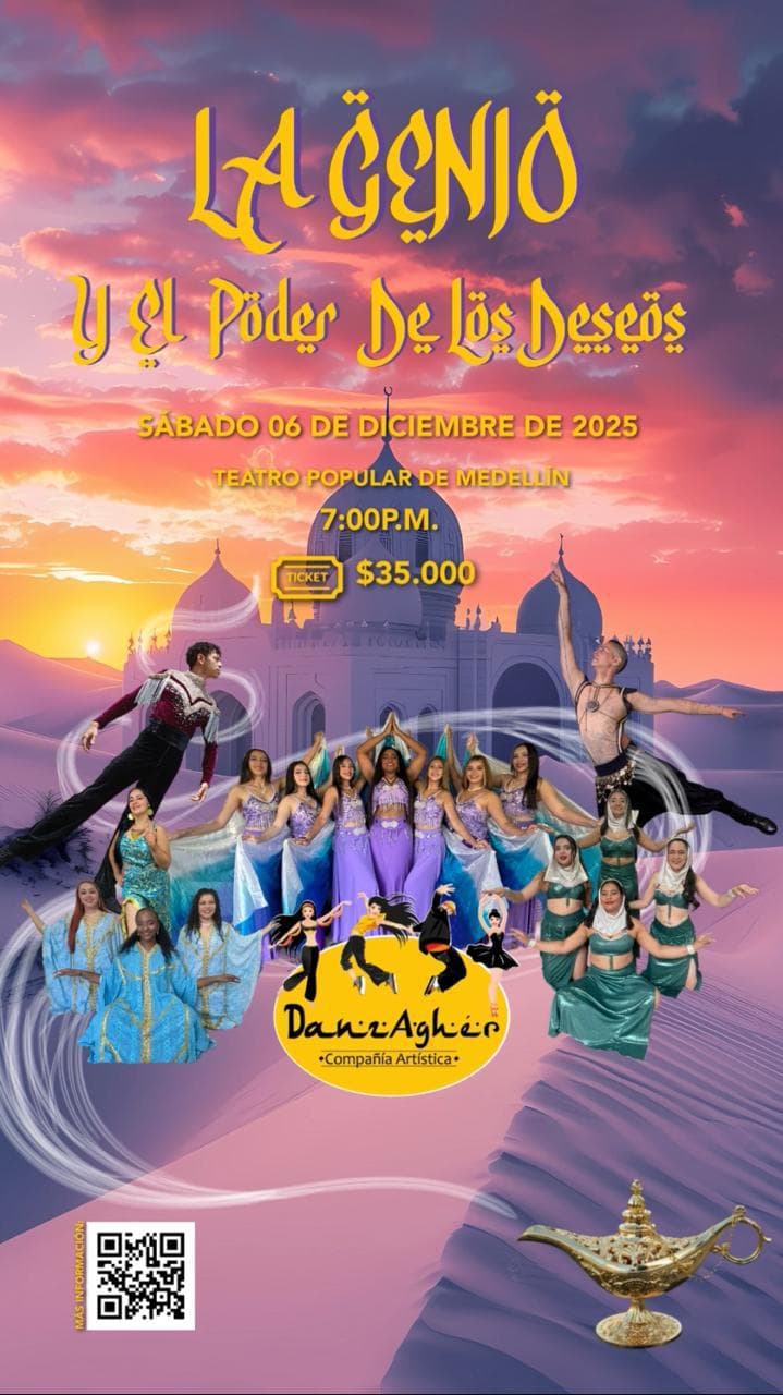 ✨ Prepárate para vivir una noche llena de fantasía, danza y sueños que cobran vida con La Genio y el Poder de los Deseos, el nuevo espectáculo de DanzAgher Compañía Artística, de la Comuna 4 – Aranjuez, que te transportará a un mundo donde todo es posible.