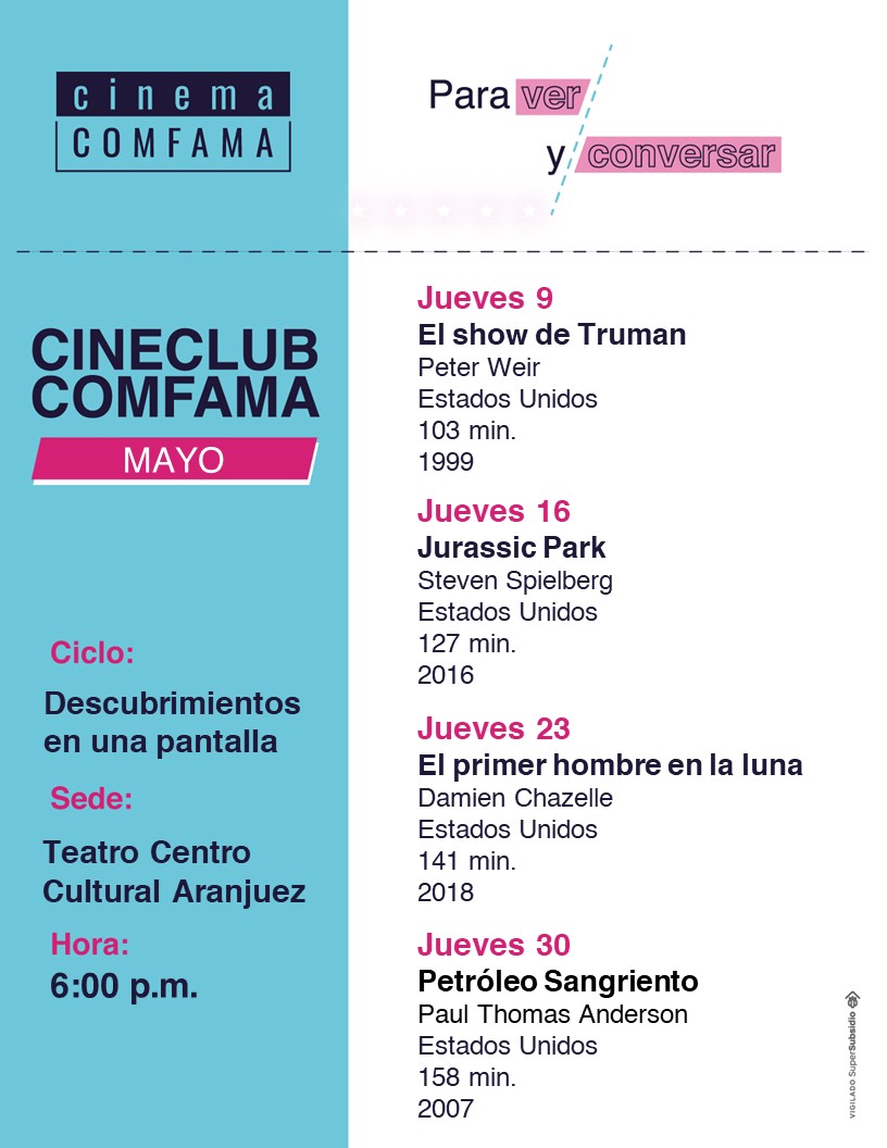 🚶♀️Ven y anímate a participar de la cinematografía que trae el Cinema Comfama de Aranjuez para el disfruté tuyo y de tú familia. 📆Fecha: Jueves 16, 23 y 30 de mayo 🕐Hora: 06:00 P.M. 📍Lugar: Teatro Centro Cultural Aranjuez 🤗¡Te esperamos con tus amigos o familiares! Para que disfrutes noches de cine con los diferentes géneros.