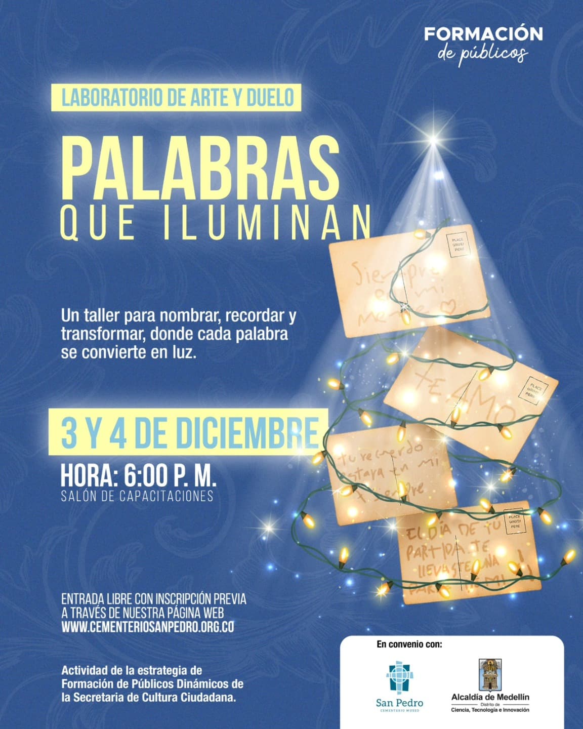 📜El Laboratorio de Arte y Duelo invita a la comunidad a participar en “Palabras que iluminan”, un taller diseñado para nombrar, recordar y transformar las emociones a través del poder de la palabra. En este espacio íntimo y significativo, cada mensaje se convierte en luz, cada memoria en un gesto simbólico y cada sentimiento en una oportunidad para resignificar el duelo desde la creatividad.
