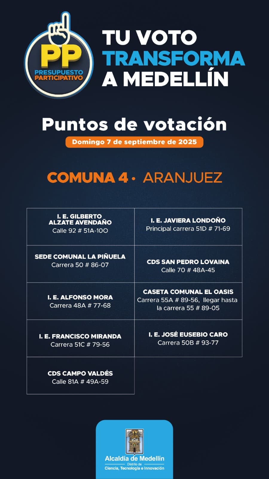 📢 Habitantes de la Comuna 4 – Aranjuez, ya están definidos los 9 puestos de votación para las elecciones presenciales del domingo 7 de septiembre.