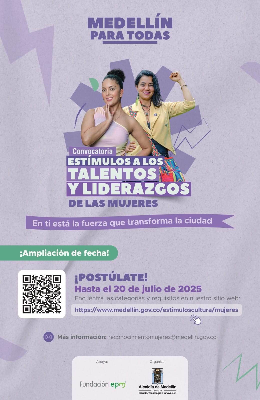 🏬La Alcaldía de Medellín, con el apoyo de la Fundación EPM, amplía el plazo para postularse a la Convocatoria Estímulos a los Talentos y Liderazgo de las Mujeres.