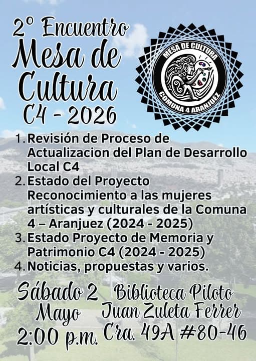 🤩 La Mesa de Cultura de la Comuna 4 – Aranjuez invita a toda la comunidad artística y cultural al segundo encuentro del 2026. Un espacio autónomo de gobernanza y participación para fortalecer el tejido social del territorio.