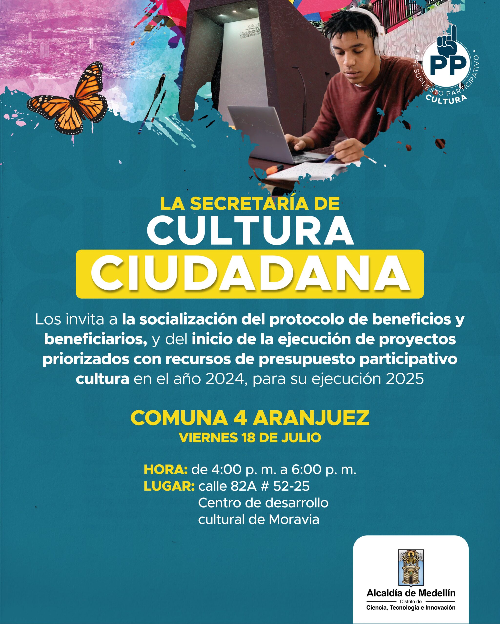 🗣️La Secretaría de Cultura Ciudadana invita a la comunidad a participar en la socialización del Protocolo de Beneficios y Beneficiarios, así como del inicio de ejecución de los proyectos priorizados con recursos de Presupuesto Participativo Cultura vigencia 2024 – ejecución 2025.