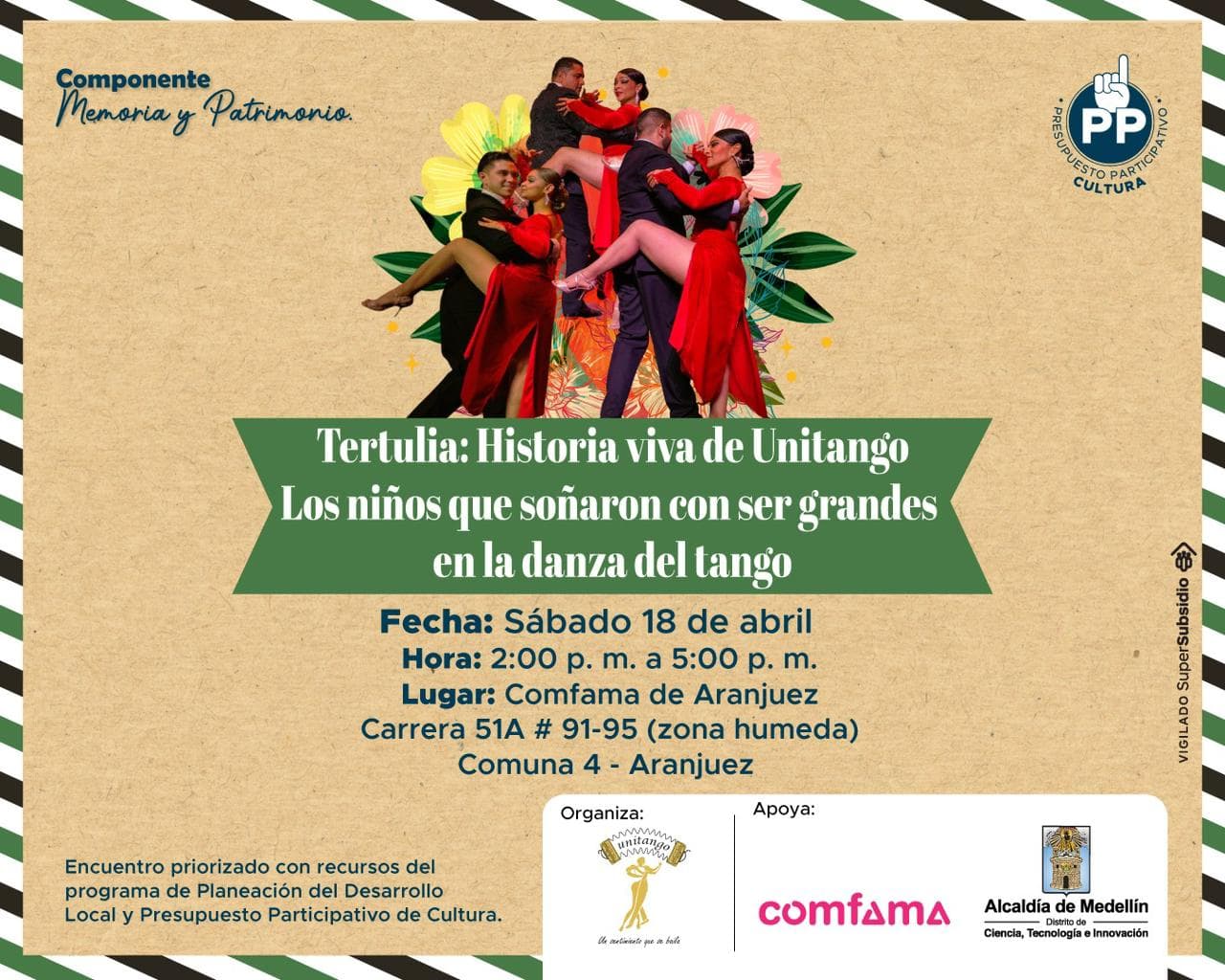 🤩 La Compañía Unitango invita a la comunidad de la Comuna 4 – Aranjuez a la tertulia «Los niños que soñaron con ser grandes en la danza del tango». Un espacio para descubrir cómo el tango no solo se baila, sino que se vive y se recuerda a través de las historias de quienes encontraron en el movimiento un camino de vida y un legado cultural para nuestro territorio.