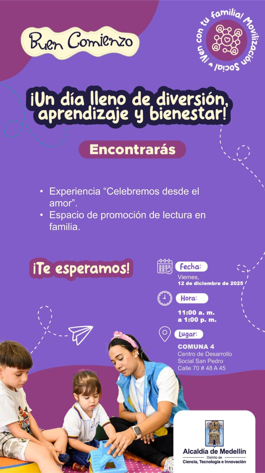 ❤️ El Programa Buen Comienzo invita a las familias de la Comuna 4 a vivir una jornada llena de diversión, aprendizaje y bienestar. Será un espacio pensado para fortalecer los vínculos afectivos, promover la lectura y disfrutar de experiencias significativas junto a los más pequeños.
