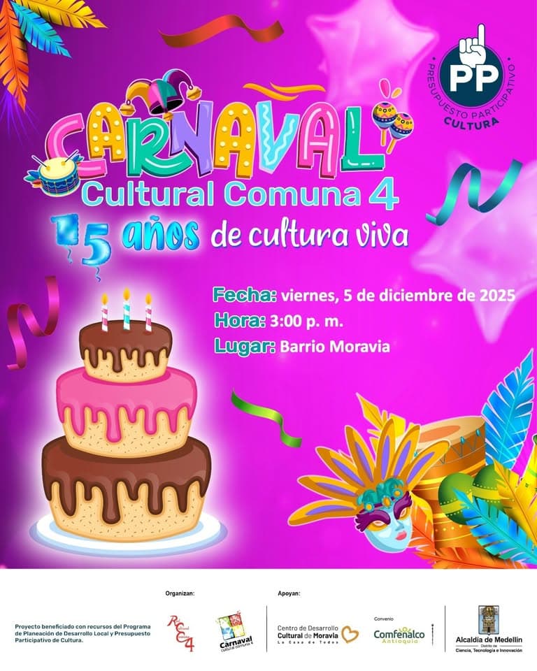 👉 Evento organizado por Carnaval Cultural Comuna 4 y Red Cultural C4, con el apoyo del Centro Cultural de Moravia, Comfenalco Antioquia y la Alcaldía de Medellín.
