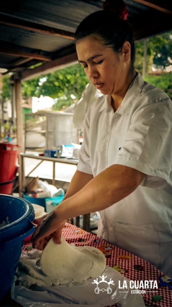 “Yo le ayudaba a mi mamá a moler, aunque, pues no era mucho el voleo, porque en aquel entonces sacábamos una parrilla y vendíamos dos o tres arepitas. Una vez pusimos el fogón a enfriar, mientras que bajamos otras cositas y ¡pum!, se lo robaron y nos dejaron sin fogón. (…) esto antes no tenía techito, sino que usábamos un plástico y esto era puro pantano, este camino no existía y estos asientos tampoco, en su lugar teníamos puros tronquitos de madera de cuando cortaban los árboles de acá y nos los regalaban. Nosotros los poníamos ahí, el más grande era la mesa y los más pequeñitos eran las sillas y ya la gente se iba sentando”.