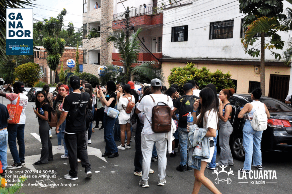 “Bienvenidos a Andareguiando Aranjuez, el día de hoy vamos a tener una experiencia que tiene como propósito recorrer y sentir este territorio a través de las historias y memorias de las organizaciones sociales, culturales, ambientales y los emprendimientos que conoceremos”, dice Jennifer Cortés, guía del recorrido que está por iniciar.